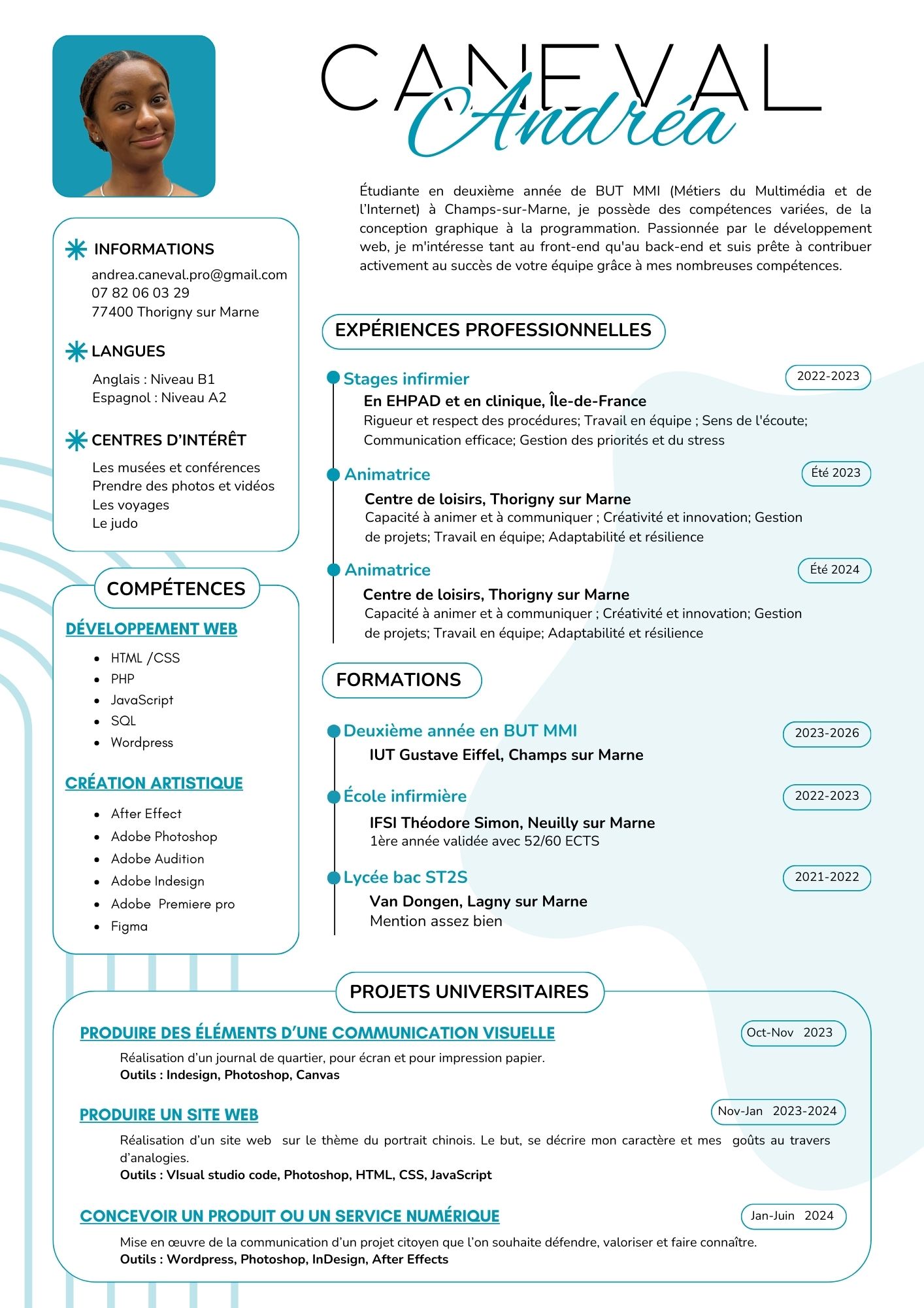 Bonjour, je m’appelle Andréa Caneval et j’ai une originalité : j’ai commencé mes études comme infirmière ! Ceci m’a permis de voir que j’avais un esprit dynamique et un fort esprit de service, cependant j’avais besoin d’exercer ma logique et mon esthétique au quotidien. Je suis donc désormais en parcours de développement web et dispositif interactif à l’IUT de Champs sur Marne. Cela m’anime chaque jour, j'adore l'idée de pouvoir gérer et afficher différents éléments à travers des lignes de codes dans différents langages de programmation. Je trouve ça fascinant.